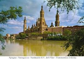 La tradición, nos lleva al 40AD, cuando el apostol Santiago el Mayor, predicaba en España. Algunos documentos afirman que Santiago, con sus nuevos discípulos, llegó en un territorio que se llamaba Celtiberia, donde estaba situada la ciudad de Zaragoza ( CesareAugusta) . De día, Santiago predicaba con sus discípulos y de noche descansaban. En la noche de 2 de Enero del año 40, Santiago estaba, junto a sus discípulos, cerca del Rio Ebro, cuando oyó voces de ángeles que cantaban; la Santisima Virgen pidió al Apóstol de construir allí una iglesia, con un altar alrededor del pilar donde estaba levantada la Virgen. Luego la Virgen desapareció y quedó el pilar. Enseguida, Santiago y sus discípulos construyeron una pequeña capilla a orillas del Ebro. En este periodo, en este sitio comenzaron las primeras peregrinaciones. También en la epoca de la Romanización, los Romanes erigieron el templo del Pilar. Pero en 1293 este templo estaba muy malparado y por eso Hugo de Motaplona promovió la restauración del templo y su conversión en la colegiata gótica mudajár de Santa Maria la Mayor. Hoy la Basílica del Pilar, constituye unos de los santuarios más importantes del mundo y recibe continuas peregrinaciones.